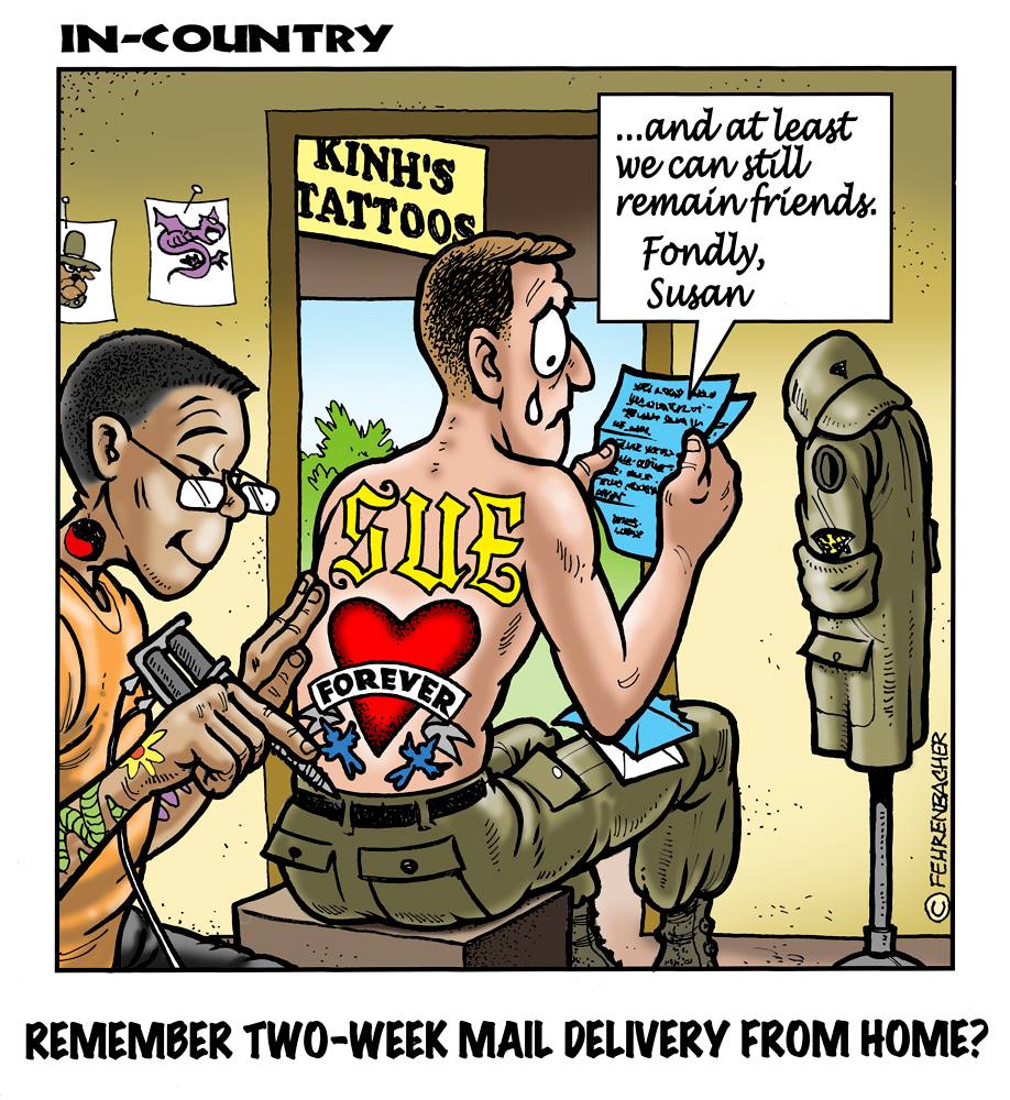 Phil enlisted in the Army in 1965 where you served for years in Vietnam.  He became a graphic designer and has worked for the state of Oregon for 26 years.  He retired in 2003 and started the Cartoon "In-Country".  The cartoons reflect his experiences during his tour of duty in South Vietnam.