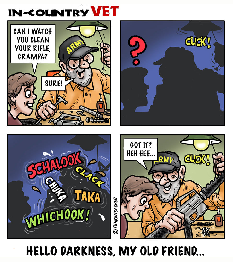 Phil enlisted in the Army in 1965 where you served for years in Vietnam.  He became a graphic designer and has worked for the state of Oregon for 26 years.  He retired in 2003 and started the Cartoon "In-Country".  The cartoons reflect his experiences during his tour of duty in South Vietnam.