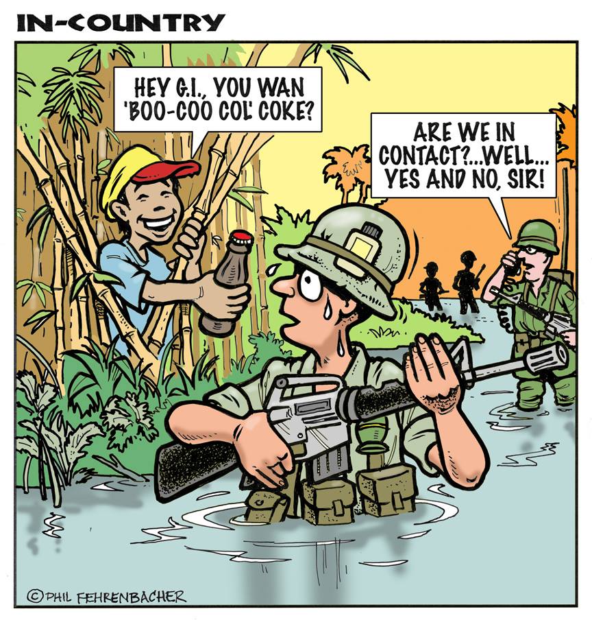 Phil enlisted in the Army in 1965 where you served for years in Vietnam.  He became a graphic designer and has worked for the state of Oregon for 26 years.  He retired in 2003 and started the Cartoon "In-Country".  The cartoons reflect his experiences during his tour of duty in South Vietnam.