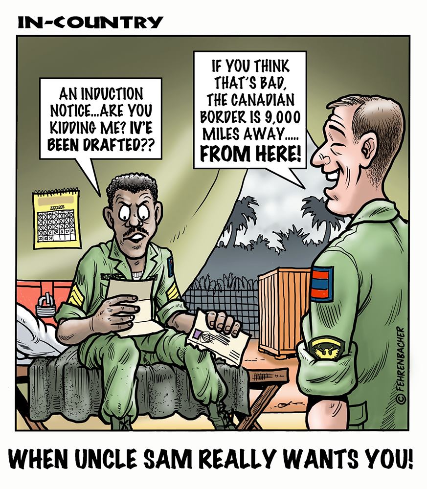 Phil enlisted in the Army in 1965 where you served for years in Vietnam.  He became a graphic designer and has worked for the state of Oregon for 26 years.  He retired in 2003 and started the Cartoon "In-Country".  The cartoons reflect his experiences during his tour of duty in South Vietnam.